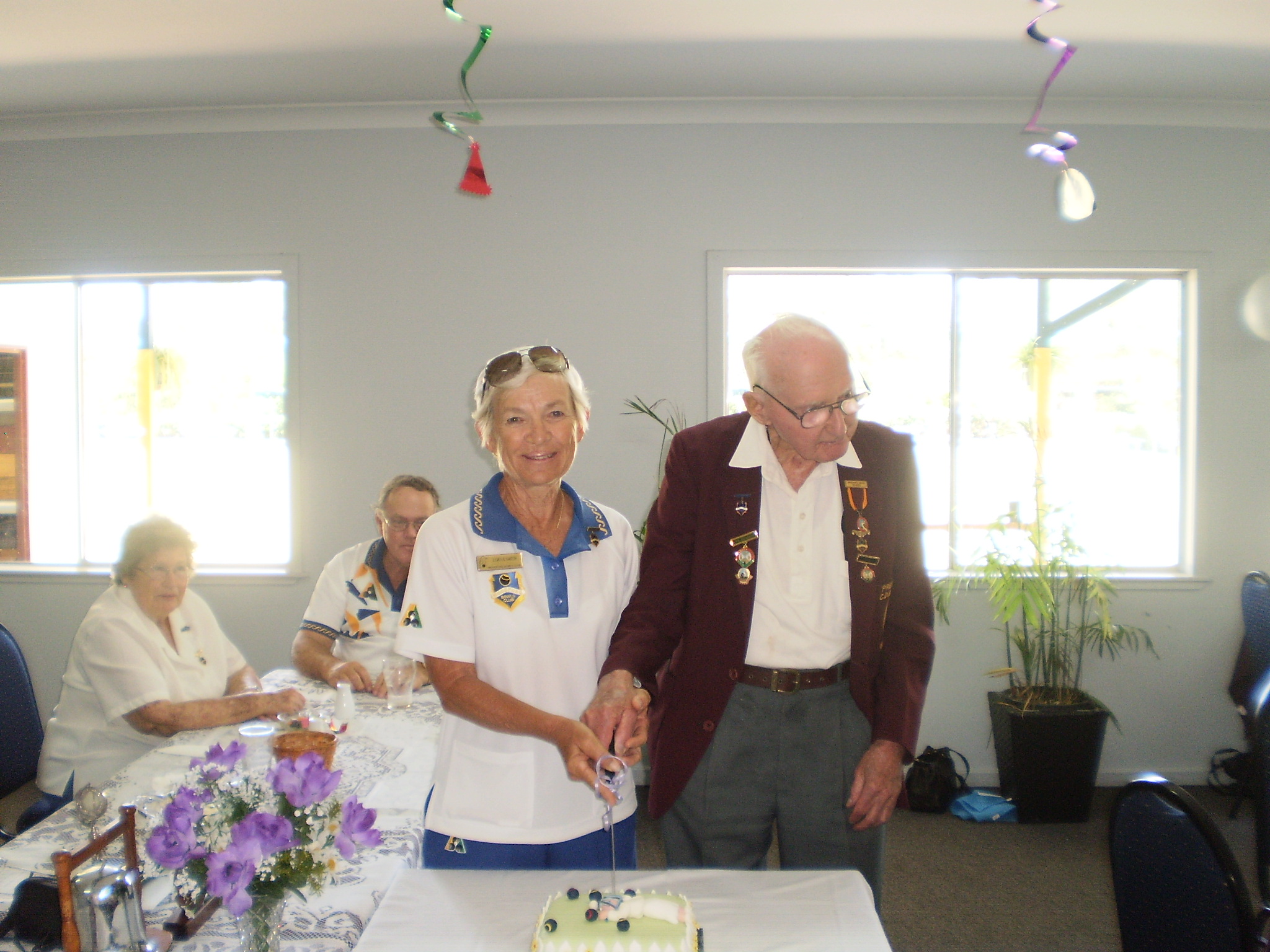 Visitor Muriel from Caboolture Memorial cutting her surprise 91st Birthday cake